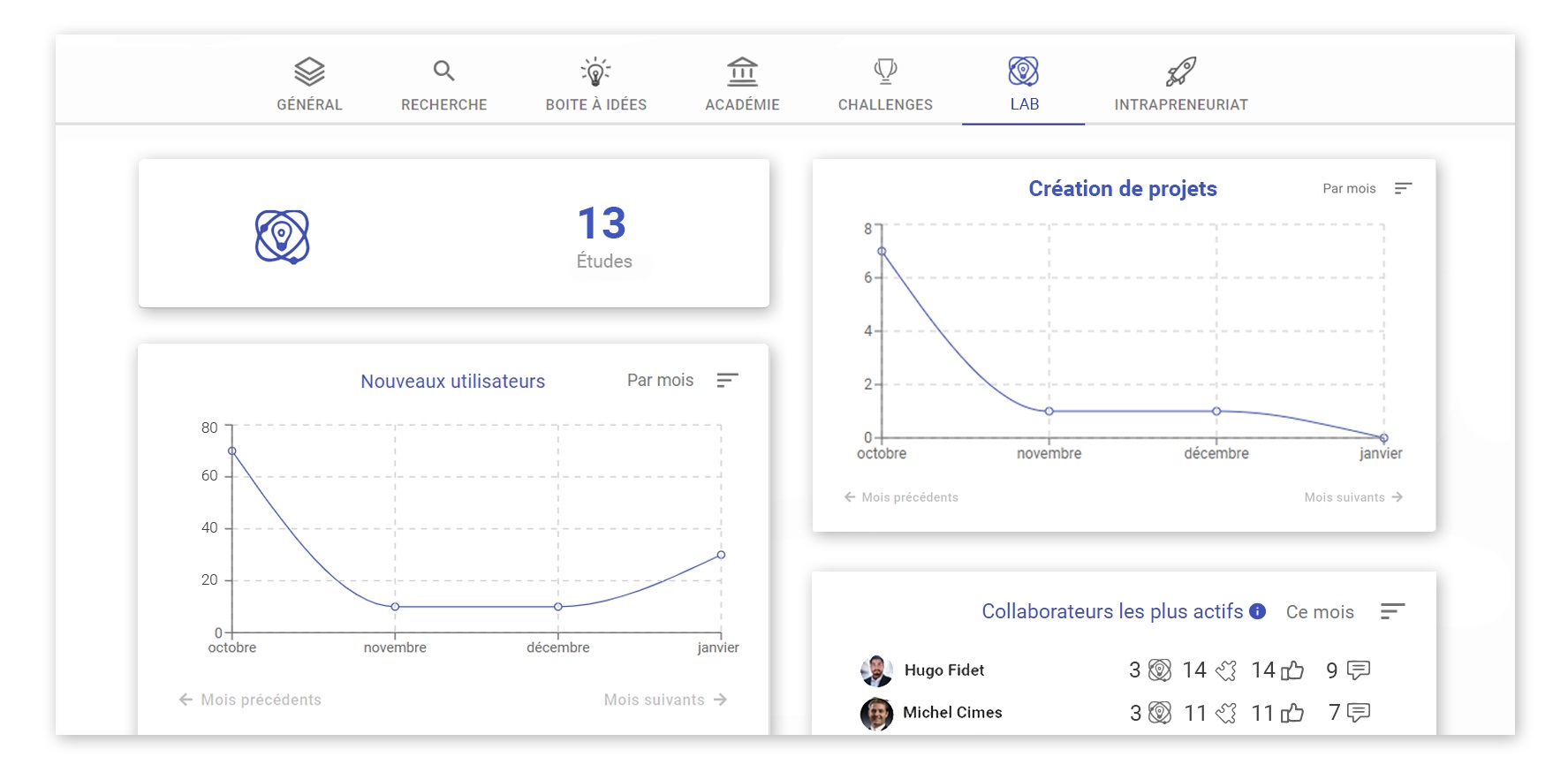 Pilotez, mesurez et analysez facilement vos démarches d'innovation. Analysez d'un coup d'œil l'activité sur votre campus, identifiez les profils les plus actifs, relancez les projets d’innovation au ralenti, agissez au quotidien et pérennisez ainsi toutes vos activités. Un outil indispensable pour rendre compte de l’impact de vos démarches auprès de votre direction et vos collaborateurs.